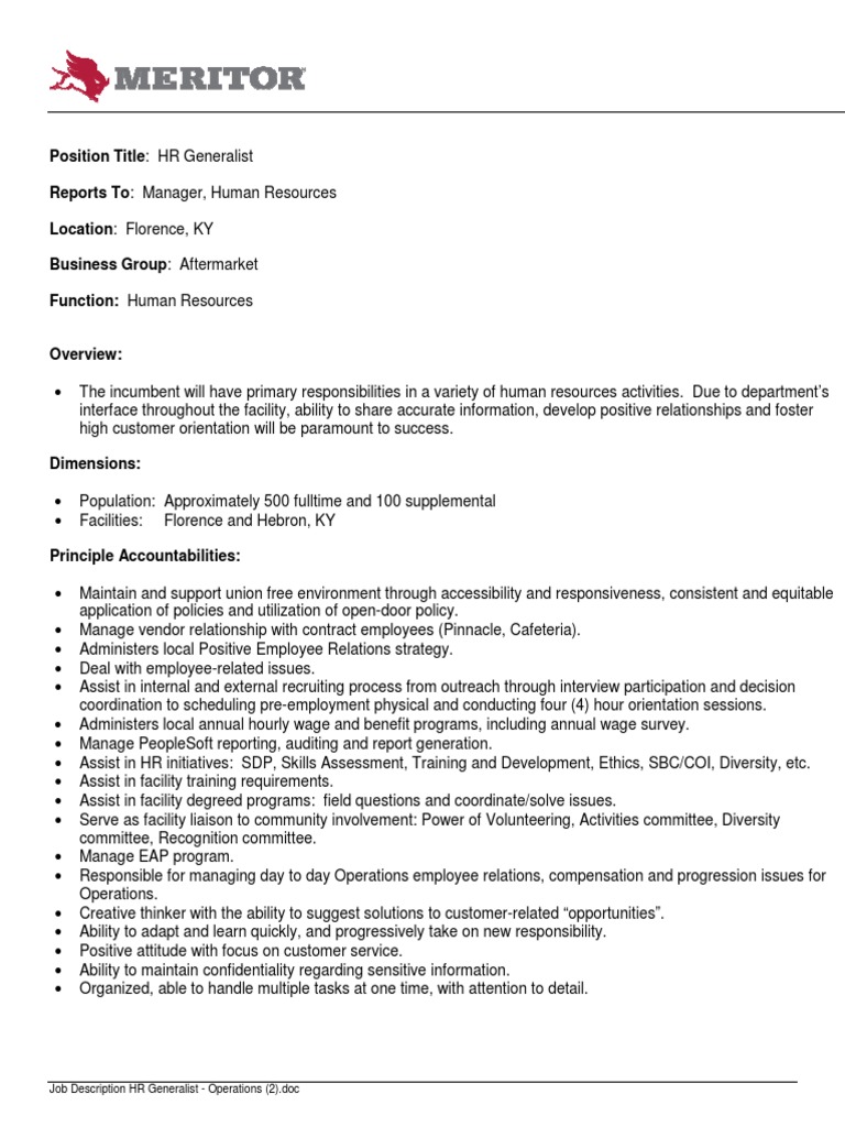 17+ FREE Human Resource Job Description Templates Free Sample Job Description Hr Generalist Web looking for a skilled hr generalist? The human resource generalist will run the daily functions of the human resource. Use this hr generalist job description as an inspiration and get ready to attract the best hr experts out there. As the name suggests, hr generalists. Web duties performed by a hr generalist usually include processing salaries, interviewing and hiring. Job Description Hr Generalist.